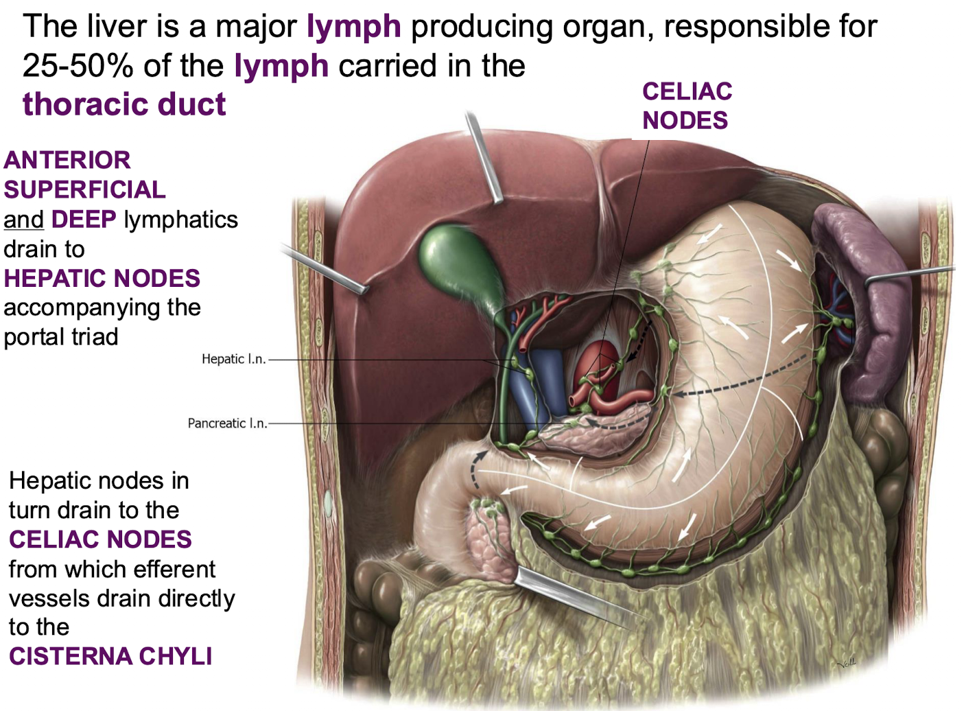ANTERIOR SUPERFICIAL and DEEP lymphatics drain to HEPATIC NODES accompanying the portal triad; which in turn drain to the CELIAC NODES; from which efferent vessels drain directly to the CISTERNA CHYLI (a dilated, sac-like structure that serves as the abdominal origin for the thoracic duct).