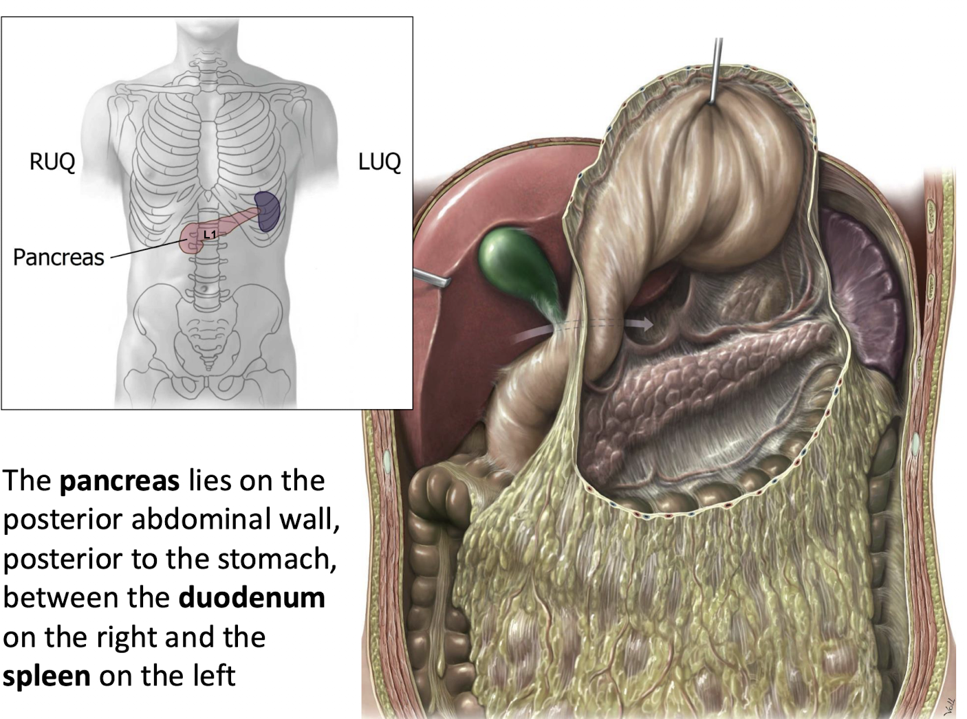 It lies on the posterior abdominal wall; posterior to the stomach; between the duodenum on the right and the spleen on the left.