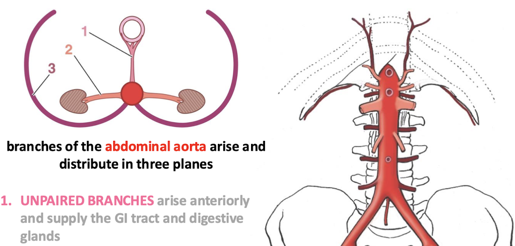 UNPAIRED BRANCHES of the abdominal aorta arise from which aspect and supply which structures?