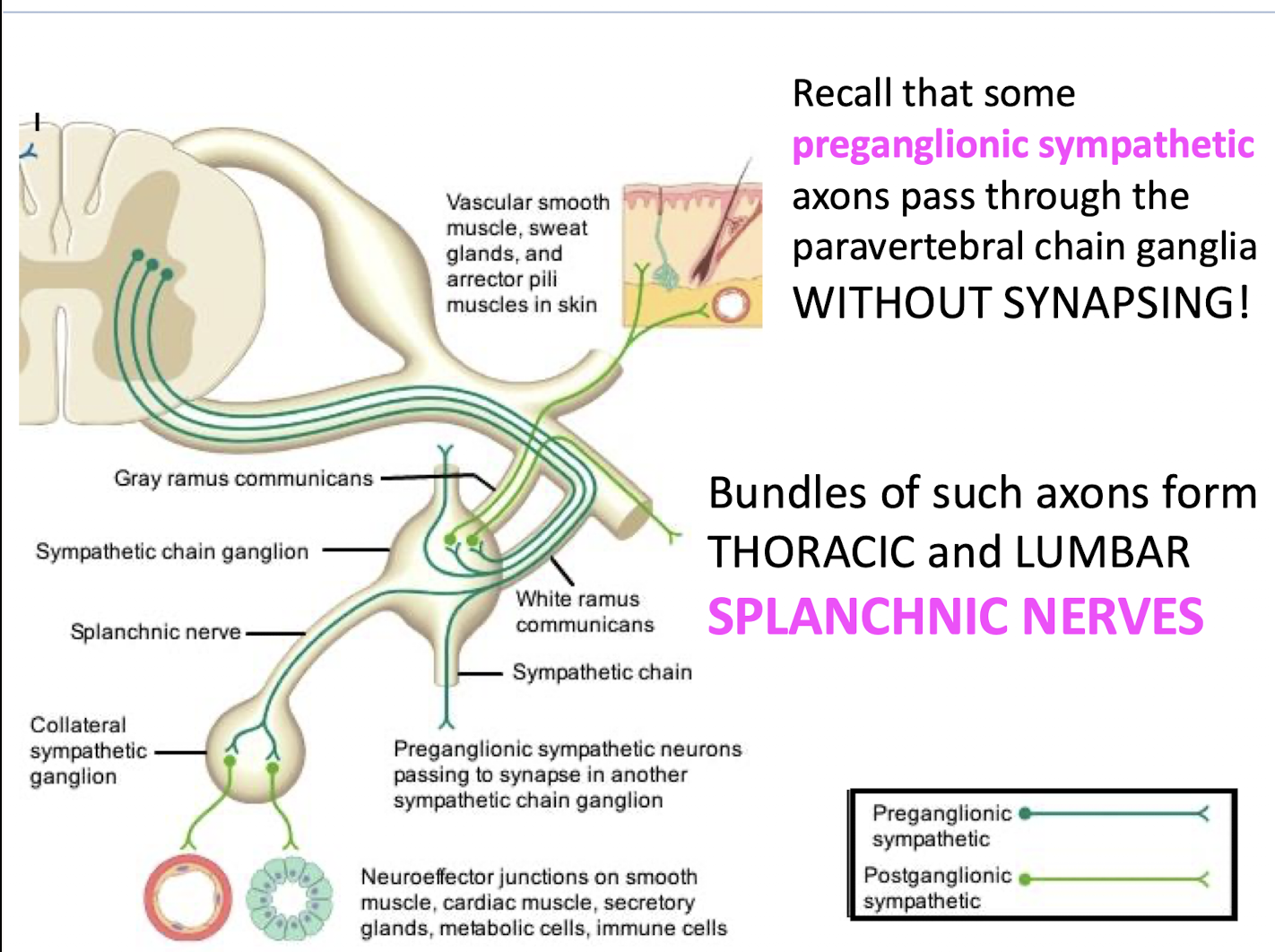 Origin/Bypass: Axons leave the spinal cord and pass through the Paravertebral Chain Ganglia (Sympathetic Trunk) WITHOUT SYNAPSING.