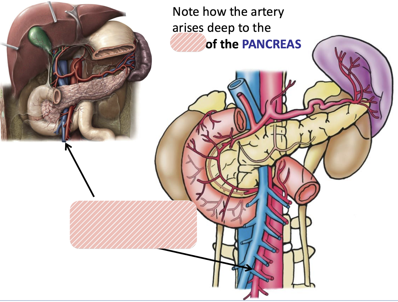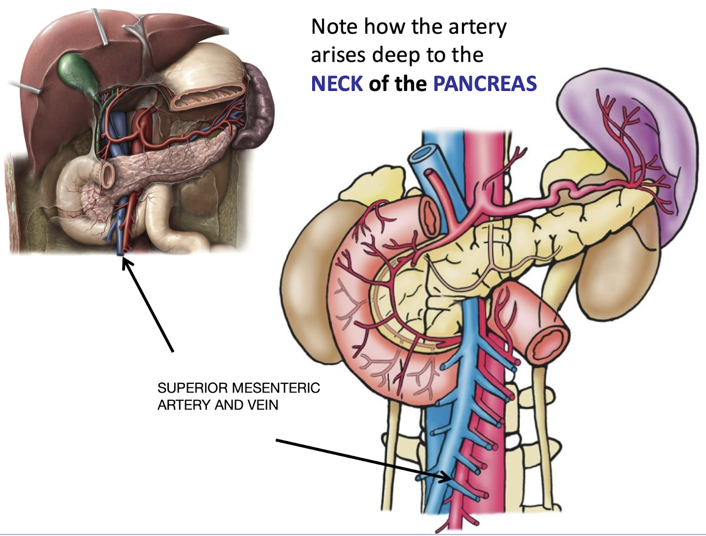 The superior mesenteric artery and vein arise deep to the NECK of the pancreas