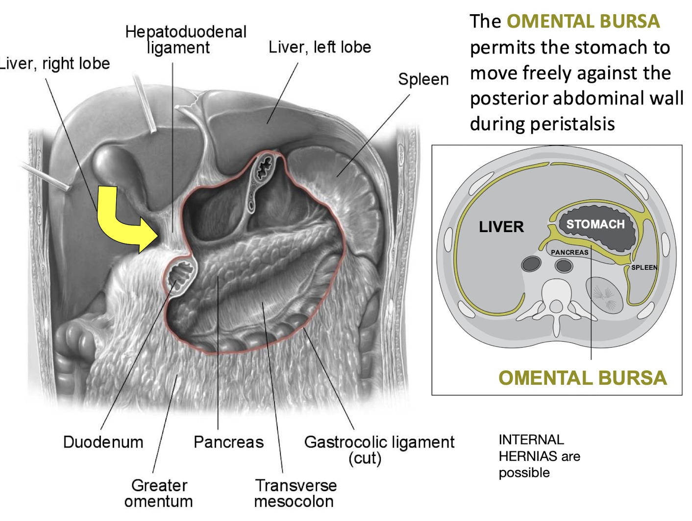What function does the OMENTAL BURSA permit? How is it related to internal hernias?