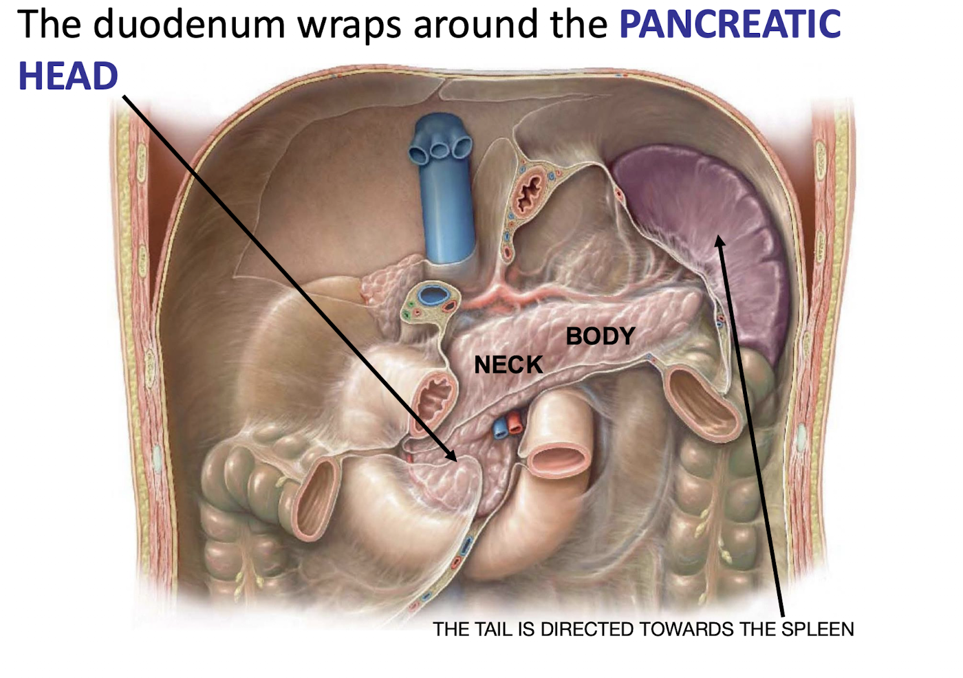What part of the pancreas does the duodenum wrap around? Where is the pancreatic tail directed?