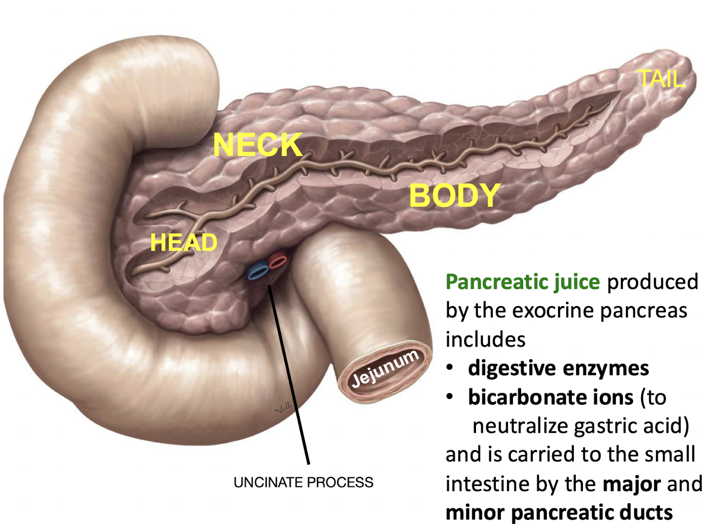 What components are included in pancreatic juice produced by the exocrine pancreas? Where is the pancreatic juice carried to and how?