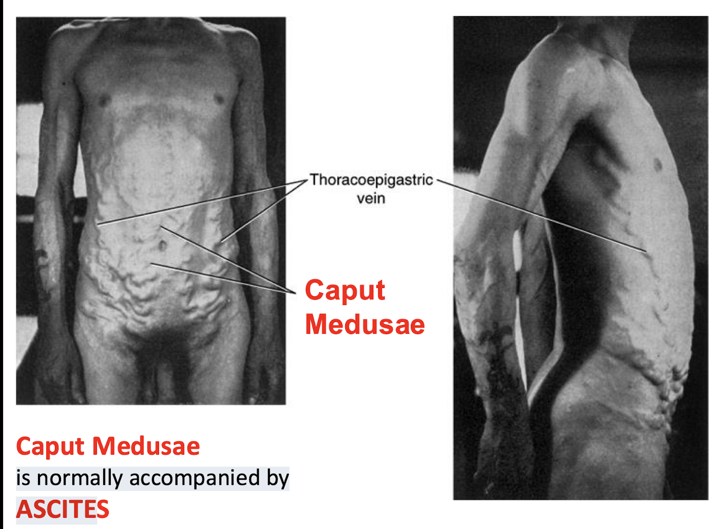 What clinical sign is associated with dilated periumbilical porto-caval anastomoses. What is it normally accompanied by?