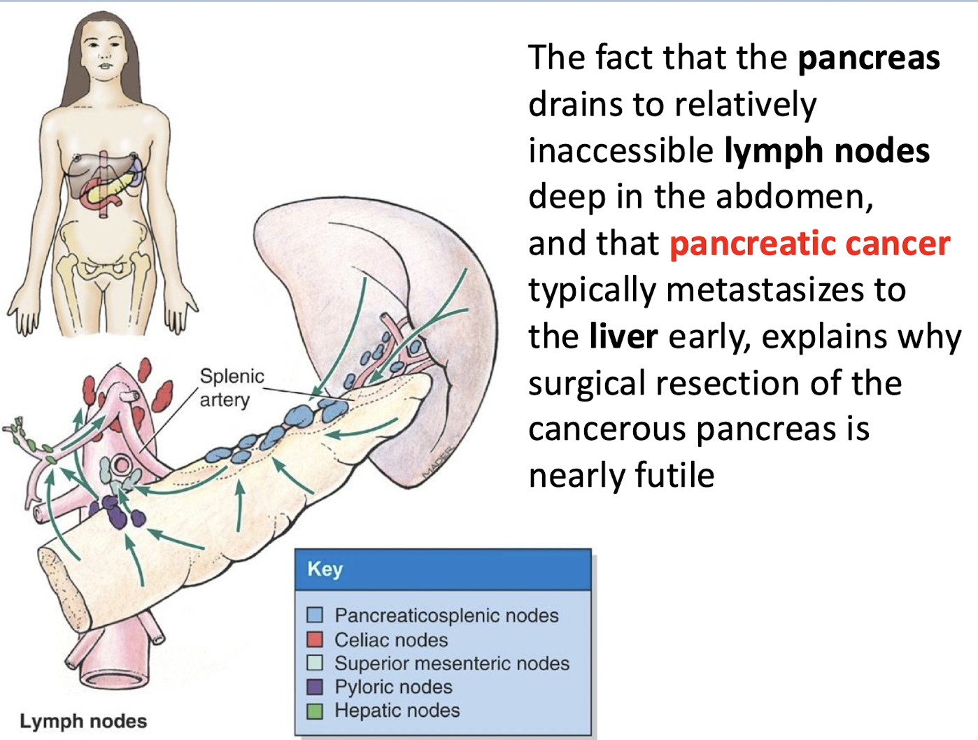 The pancreas drains to relatively inaccessible lymph nodes deep in the abdomen; and pancreatic cancer typically metastasizes to the liver early.