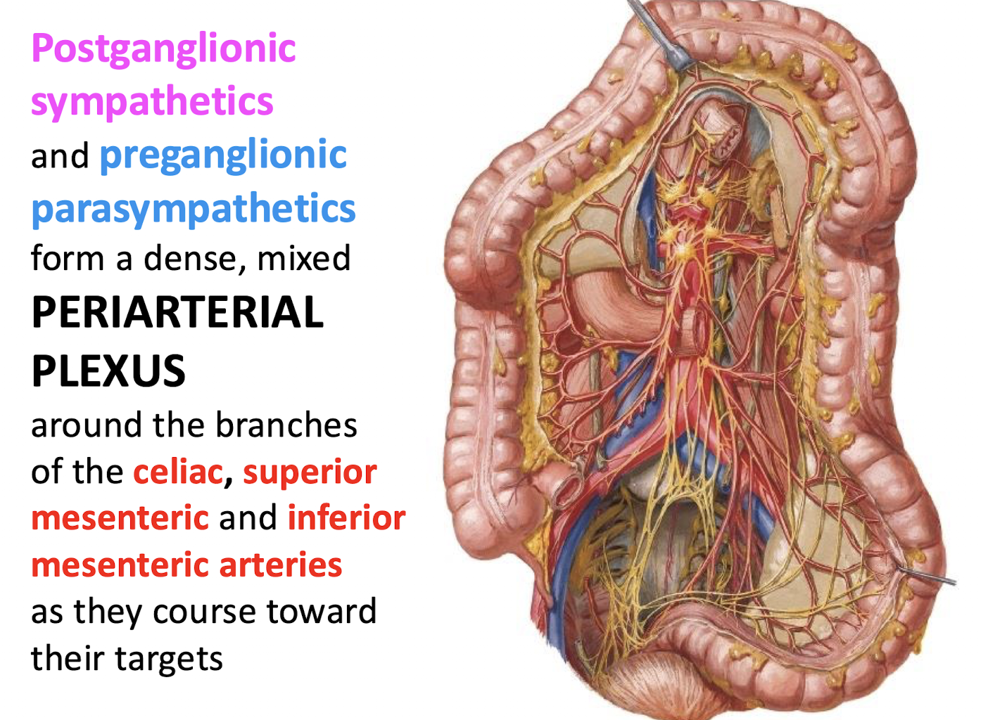 A dense; mixed PERIARTERIAL PLEXUS around the branches of the celiac, superior mesenteric and inferior mesenteric arteries