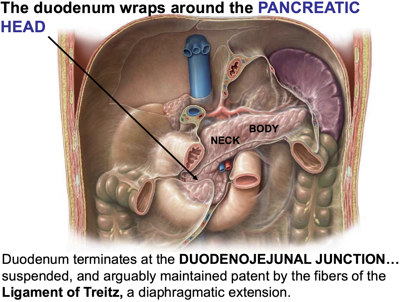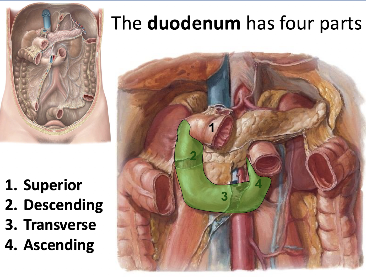 How many parts does the duodenum have? What are they? What is unique about parts 2-4?