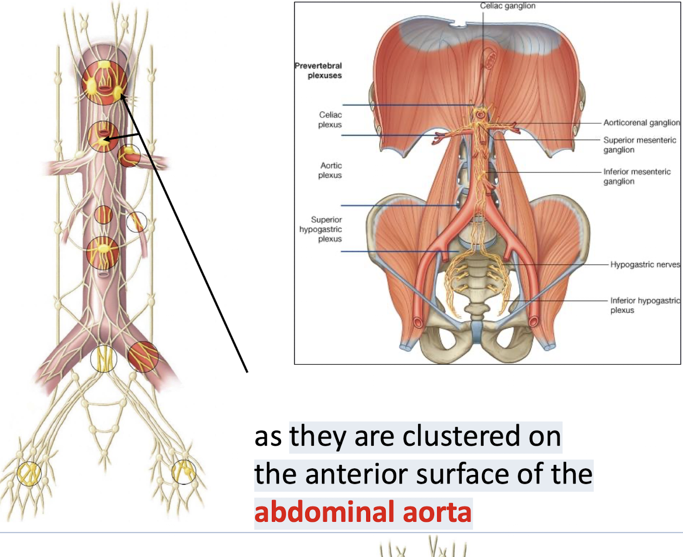 Location: These nerves travel to ganglia clustered on the anterior surface of the abdominal aorta (Prevertebral location).