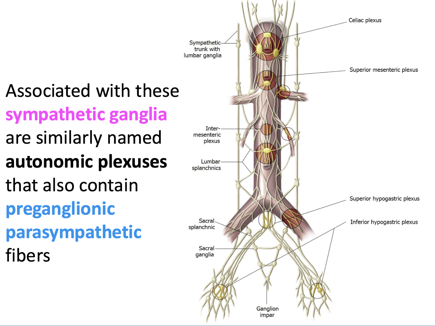 What type of fibers do the autonomic plexuses associated with sympathetic ganglia also contain