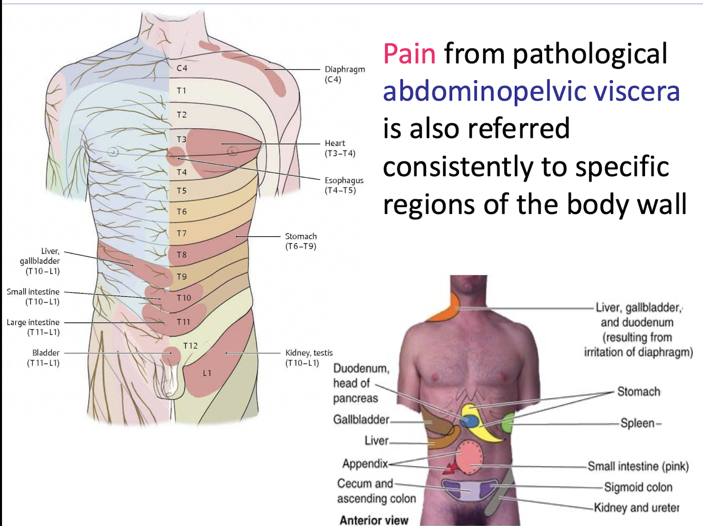 Pain signals from diseased or injured abdominopelvic organs are consistently referred to specific, predictable regions of the body wall.