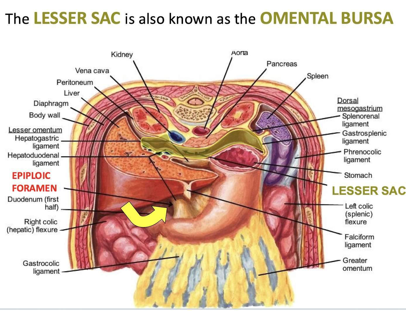 A large, blind recess of the peritoneal cavity created by the rotations of the stomach during development.