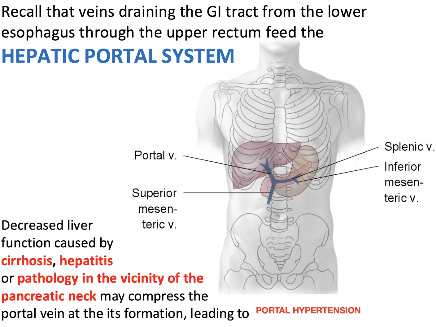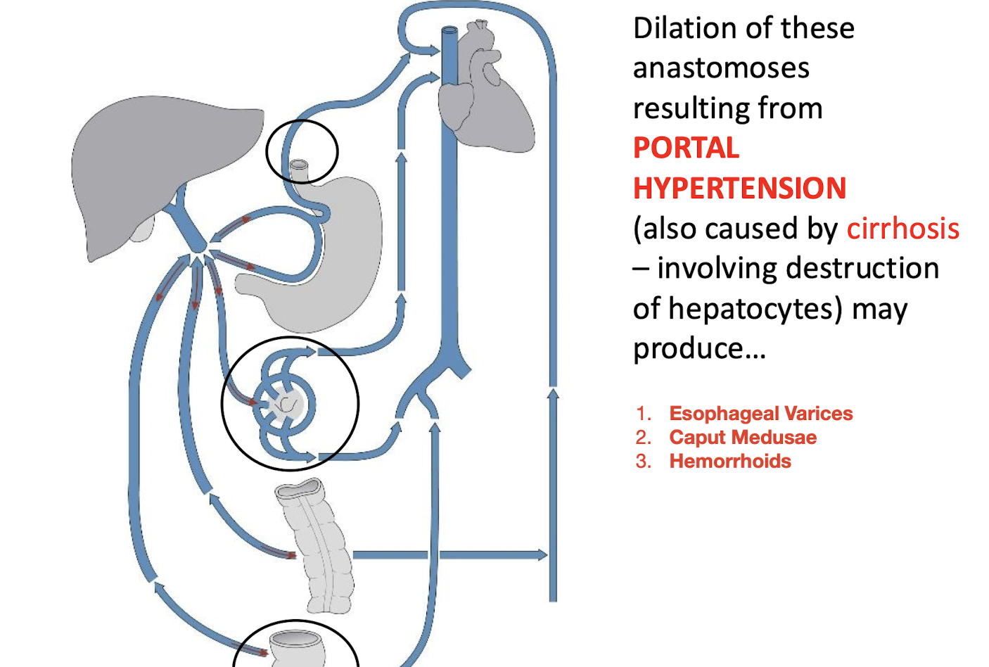 (Portal hypertension is often caused by cirrhosis, which involves destruction of hepatocytes.)