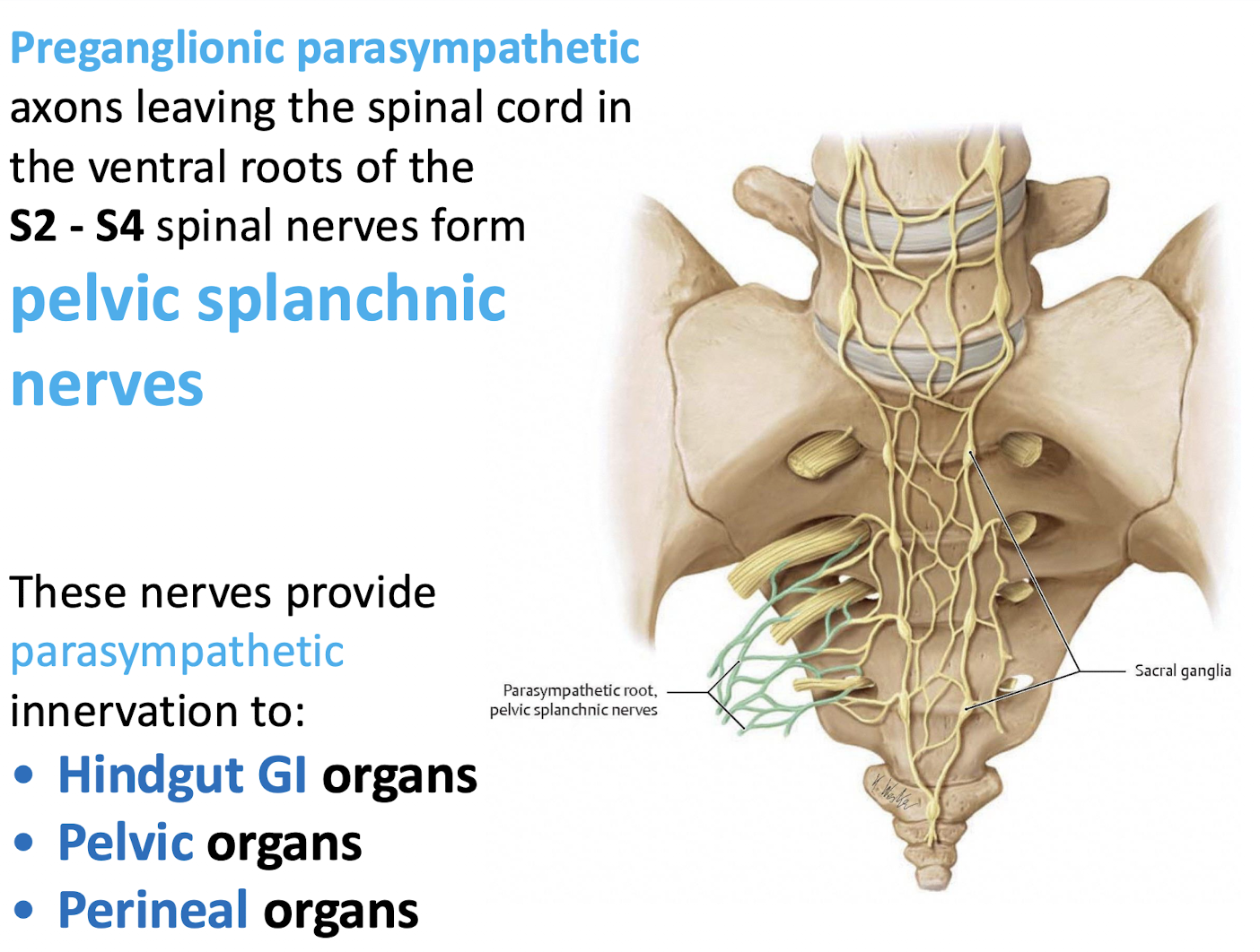 Preganglionic parasympathetic axons leaving the spinal cord in the ventral roots of the S2 - S4 spinal nerves.