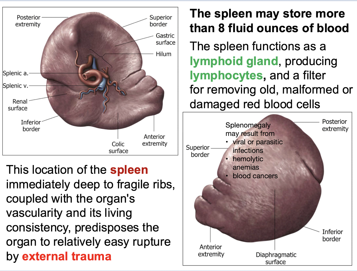 Its location immediately deep to fragile ribs; coupled with the organ's vascularity and its living consistency, predisposes the organ to rupture by external trauma