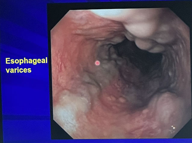 Dilated veins in the esophagus, risk of rupture and bleeding.