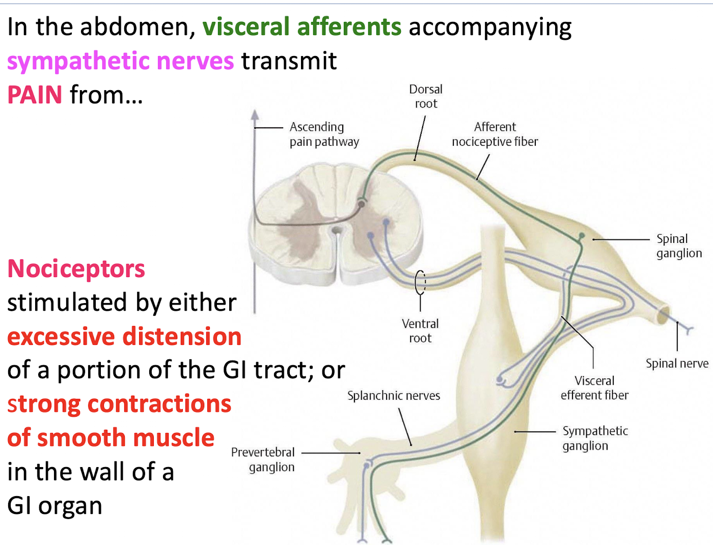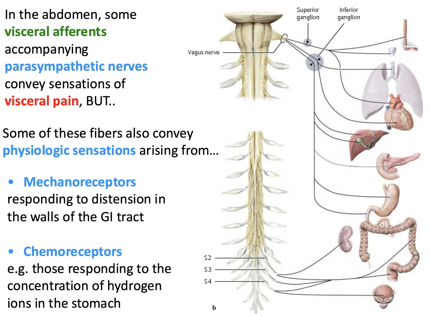 Sensations of visceral pain; and physiologic sensations arising from Mechanoreceptors responding to distension in the walls of the GI tract; or Chemoreceptors e;g; those responding to the concentration of hydrogen.