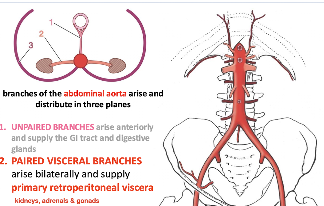 PAIRED VISCERAL BRANCHES of the abdominal aorta arise from which aspect and supply which structures? Name examples