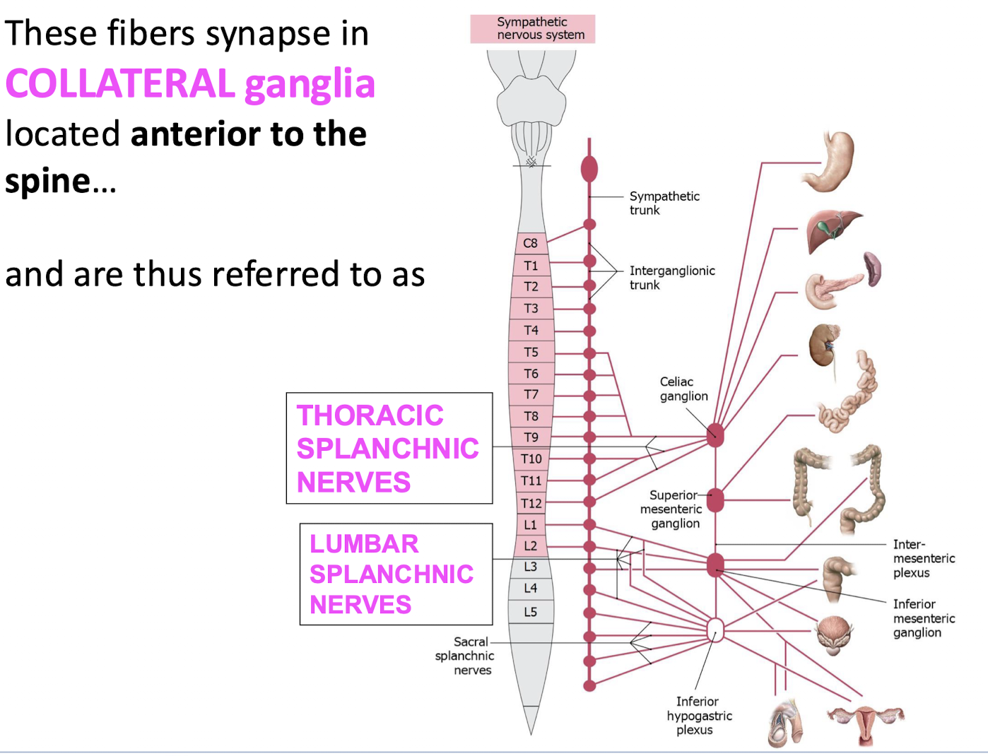 Synapse: The fibers synapse in Collateral (Prevertebral) Ganglia (e.g., Celiac, Superior/Inferior Mesenteric Ganglia) located anterior to the spine.