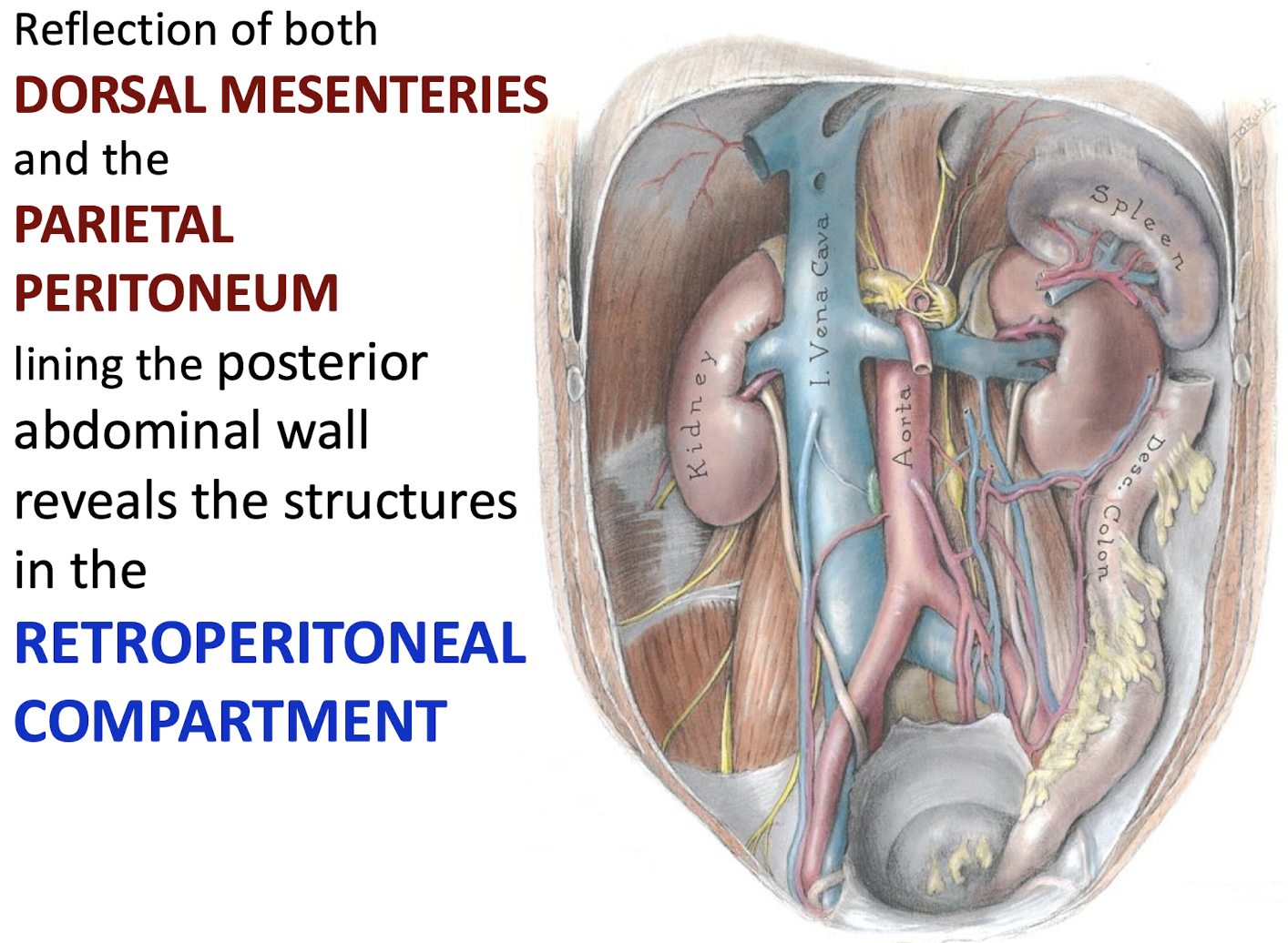 What structures are revealed upon reflection of both DORSAL MESENTERIES and the PARIETAL PERITONEUM lining the posterior abdominal wall