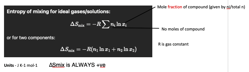 increase in entropy that occurs when two or more substances are mixed, due to the increase in the number of possible arrangements of particles.