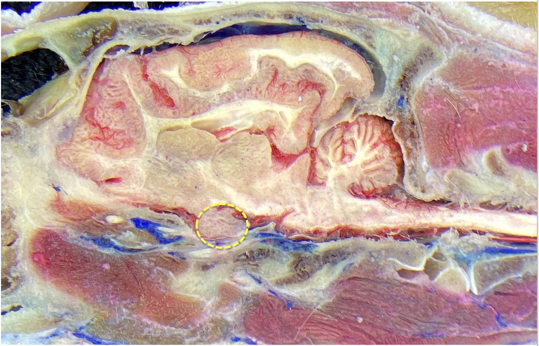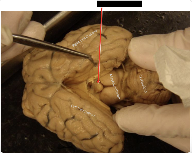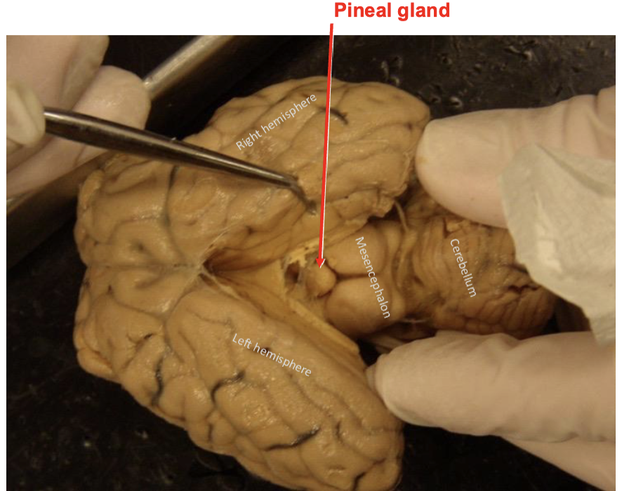 Located in the middle of the encephalon. In the area known as diencephalon. Caudo-dorsal to the thalamus