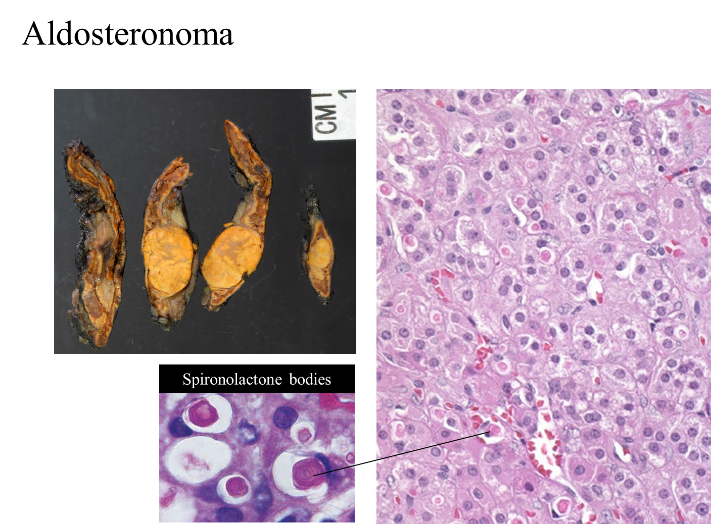 Aldosteronomas are identifiable by the presence of spironolactone bodies following treatment of spironolactone
