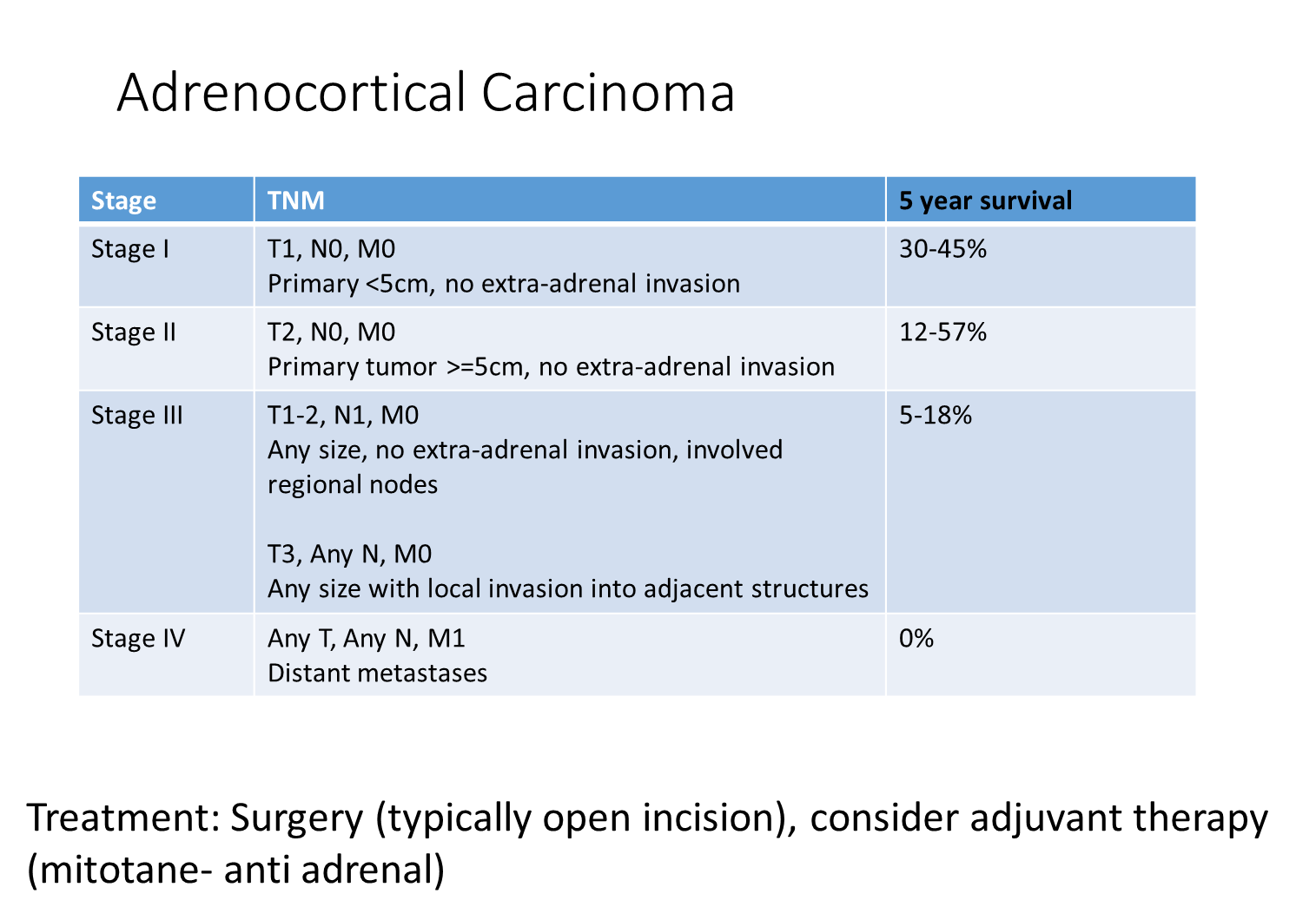Adrenocortical Carcinoma is staged based on the TNM into four stages