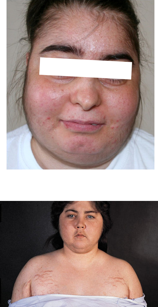 → patients have weight gain, moon faces, diabetes, and purple striae