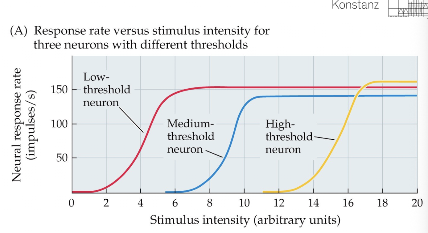 Frequency Coding: A single neuron conveys intensity through the rate of firing. (Receptor potential also plays a role here. As a result, the “firing threshold” for action potentials along the axon can be reached much more quickly and more frequently in succession.)