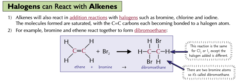 Describe the reaction of a halogen and an alkene