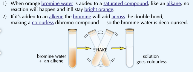 But when added to an alkene the bromine will add across the double bond, making a COLOURLESS solution. you MUST SHAKE to make it work.