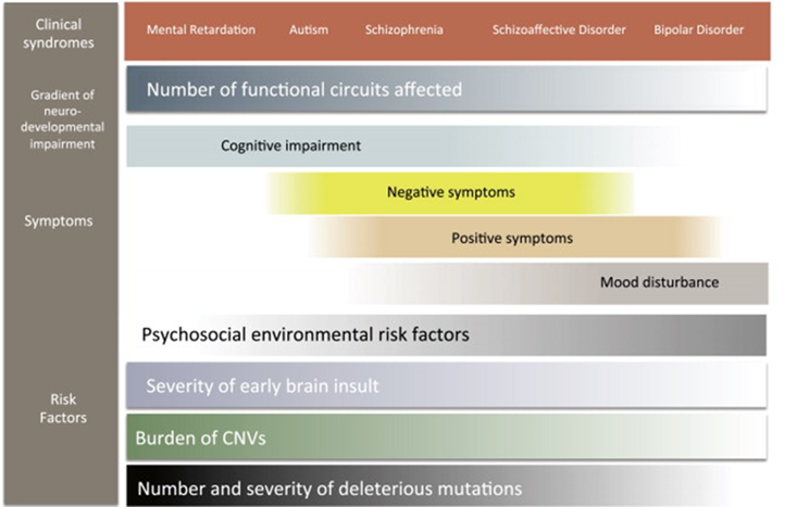 Some clinical syndromes will differ between the prominent causing factors, E.g mental retardation has a large neurodevelopmental contribution, smaller psychosocial contribution
