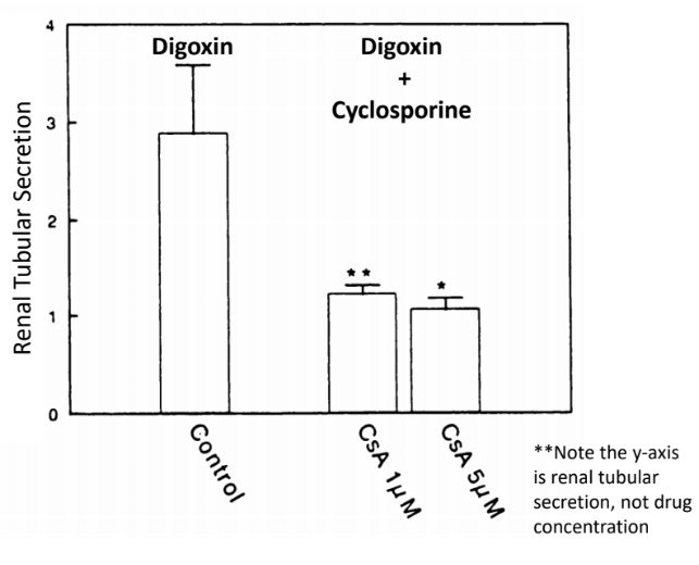 Digoxin + Cyclosporine —> reduces tubular secretion (INCREASED digoxin plasma levels)