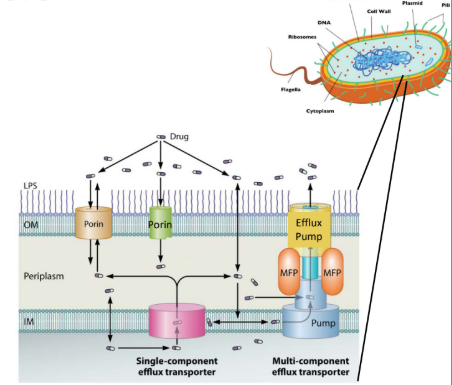 What transporter channels remove antibiotics from cell membrane (decreases intracellular antibiotic conc)l?