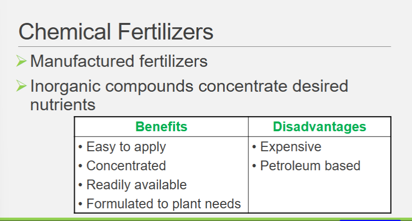 Manufactured fertilizers (come in forms like dry, liquid, water soluble)