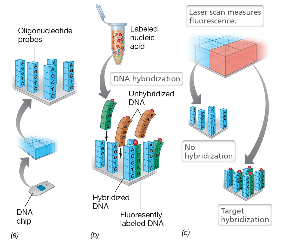 A microarray contains thousands of microscopic spots of DNA oligonucleotides, each spot representing a specific gene or section of DNA.