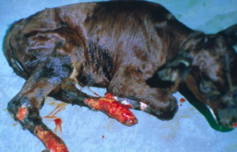Also called hot-spot dermatitis. It is initiated by self-trauma (e.g., due to allergies). It is a focal area that is usually intensely painful. Hot weather and a dense coat predispose dogs to this condition.