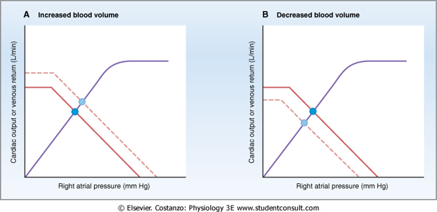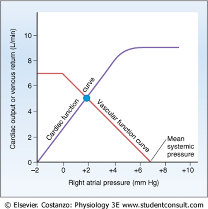 Relationship between cardiac output and right atrial pressure (venous return= increase in right atrial pressure, EDV and end diastolic fiber length, leads to increase in CO)