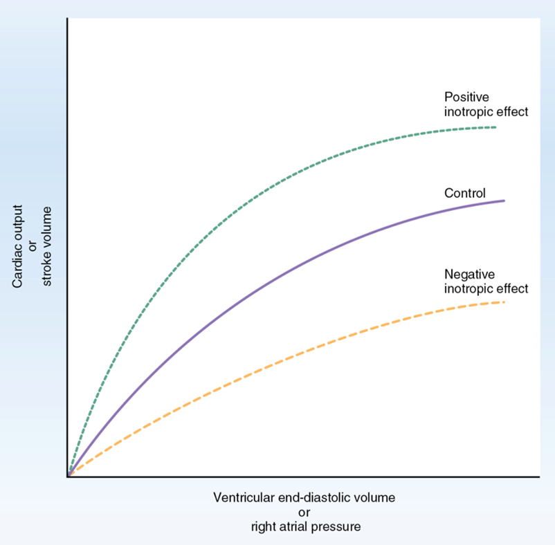 Force of contraction at a given preload affecting stroke volume, direct relationship with ventricular output/CO, increased contractility increases cardiac output