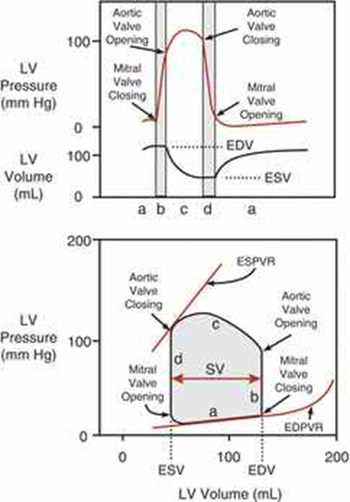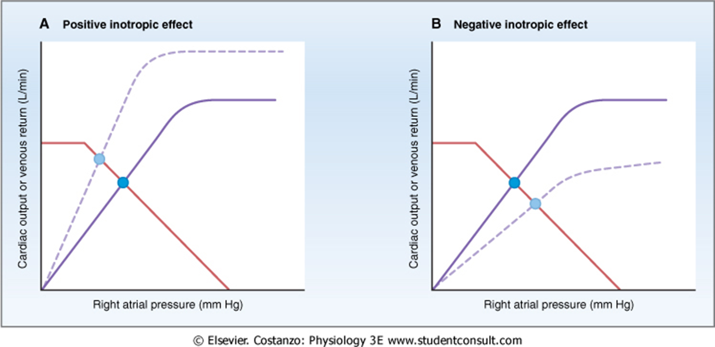 Decreasing ventricular contraction leads to reduced blood ejection, pressure in vent+ exits dec., venous return continues