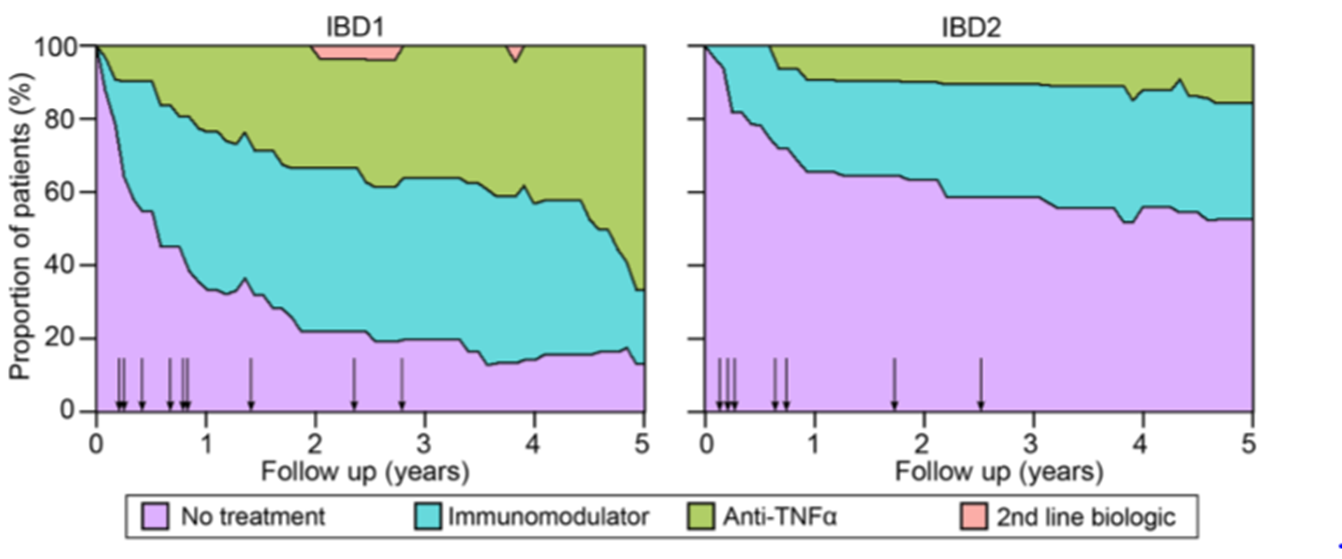 •Stacked density plots demonstrating the maximum medical therapy that was required during 5 years’ prospective follow-up in the IBD1 and IBD2 subgroups. Treatments were plotted hierarchically (no treatment<immunomodulator <antiTNFα <second-line biologicals (vedolizumab or ustekinumab)).