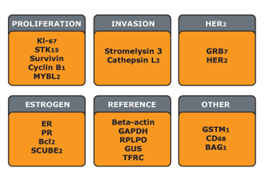•Analysis of expression levels of the mRNA of the16 genes was normalised against the reference genes to give a total recurrence score - the change in each gene’s expression was scored from 0 to 15 where 1 unit increase was the doubling of the amount of RNA.