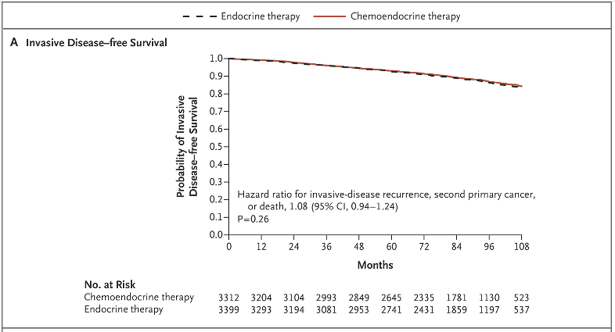 And they found that for this particular group of patients, there was no additional benefit of adding chemotherapy to endocrine and hormone therapy. There is no difference in the invasive disease free survival in either group. In other words, it didn't make any difference whether they had endocrine therapy on its own or endocrine therapy with chemotherapy.