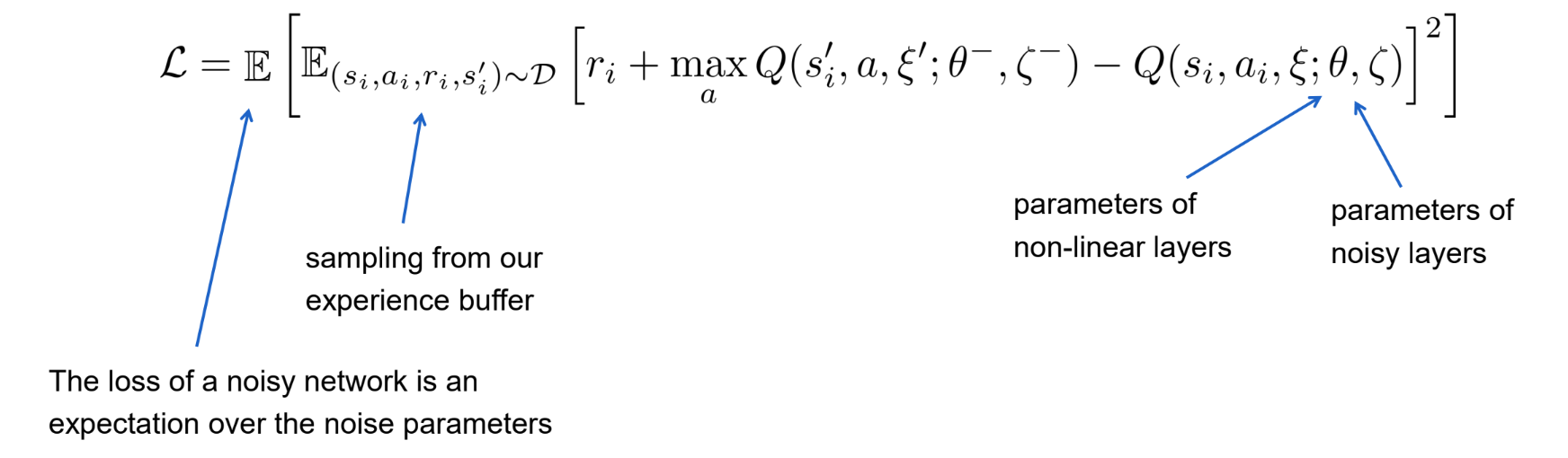 Geen ϵ-greedy nodig: De standaard exploratie-heuristieken worden vervangen door de ruis in het netwerk zelf.