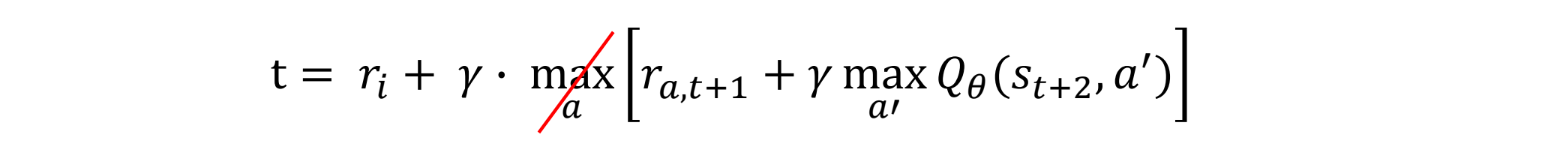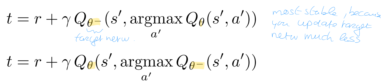 De wiskundige target voor de update in DDQN wordt hiermee: (bovenste versie)