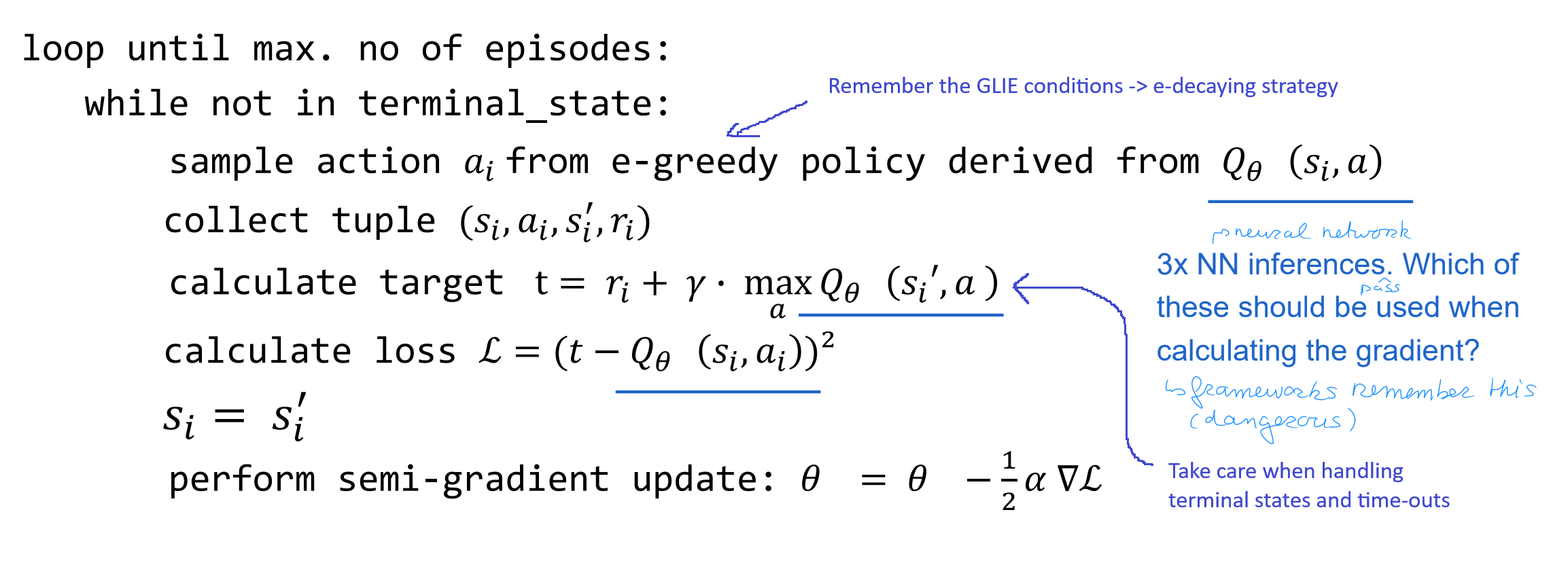 Een cruciaal wiskundig concept dat hier wordt geïntroduceerd, is de semi-gradiënt. Bij het berekenen van de gradiënt voor de gewichtsaanpassing (θ) negeren we de afhankelijkheid van de target van diezelfde θ. Dit wordt gedaan omdat het meenemen van de volledige gradiënt door de target heen de berekening extreem complex en onstabiel zou maken.
