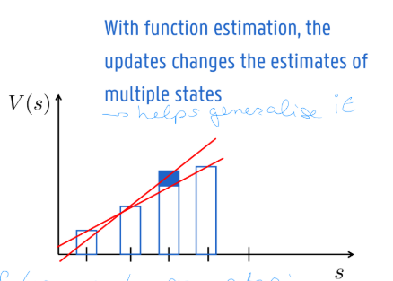 using function approximation, we can generalise from seen states to unseen states