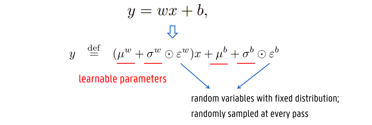 Bij een standaard lineaire laag (y=wx+b) zijn de gewichten vast. In een NoisyNet-laag worden de gewichten en de bias vervangen door een combinatie van leerbare parameters (μ en σ) en een stochastische component (ϵ):