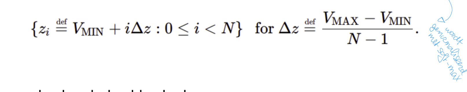 De mogelijke waarden van de return worden verdeeld over een vast aantal atomen (bins), gelijkmatig verspreid tussen een minimumwaarde (VMIN) en een maximumwaarde (VMAX).